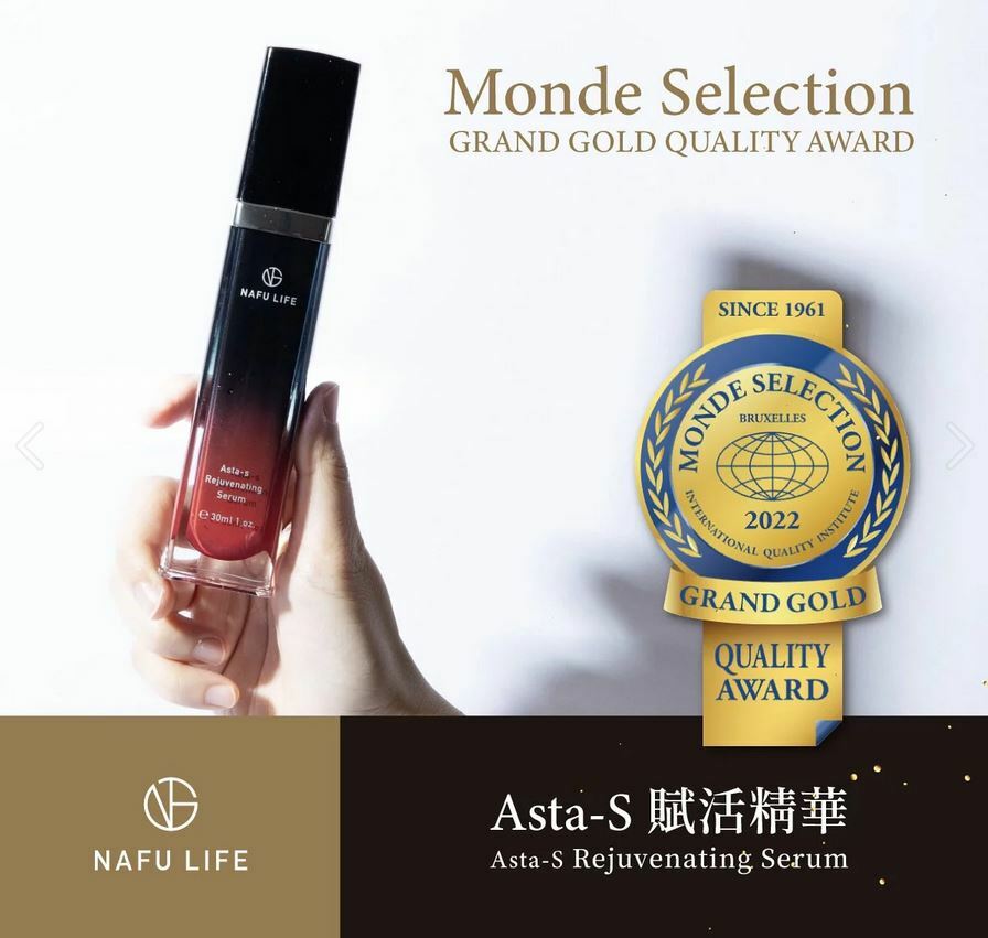 Asta-S賦活精華添加獨特珍稀成分──Asta-S超級蝦紅素,以超強保護力延緩肌膚老化,可以防止、修護肌膚產生的細紋、乾燥、黑色素沉澱等問題。此外,更添加六胜肽、海茴香植萃精華等成分,達到長效鎖水、舒緩乾燥肌膚的作用。Asta-S賦活精華更在2022年4月榮獲Monde Selection「特級金獎」肯定! 除此之外,更接連獲得國家玉山獎最佳產品類、提倡環境永續、嘉誠微笑盃的Taiwan Top 10。一舉拿下多項殊榮,NAFU LIFE不僅在國際品鑑大賞耀眼勝出,更獲得國內肯定,代表台灣研發科技實力無與倫比、世界頂尖。各種支持都是NAFU LIFE團隊繼續追求高品質、創新研發的最佳動力,致力於將科學融入美麗,賦活青春。Asta-S賦活精華獨家添加紅到NASA演講的Asta-S游離型超級蝦紅素!讓您以油喚醒青春,擺脫年齡痕跡!