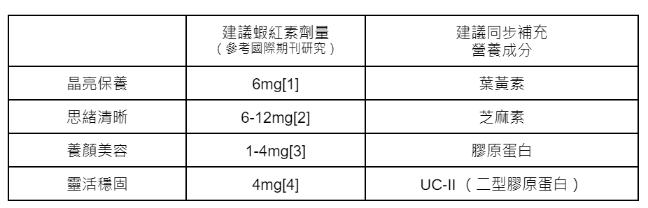 葉黃素每日攝取量台灣衛生福利部規定不得超過30mg的量。那蝦紅素每日攝取量呢?目前還沒有官方規定的每日攝取量。但針對所需的保健保養,可以參考國際文獻作為基礎依據。