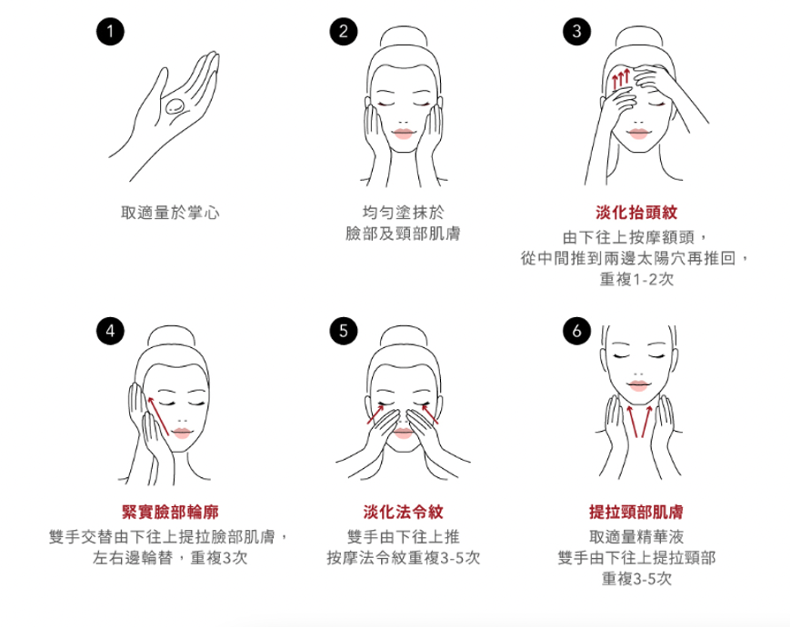 1. 適量使用:由於蝦紅素多為油狀精華,建議搭配按摩使用,但用量切不可過多,適量搭配按摩即可達到極佳的保養效果,可以針對自己比較在意或是想強化的地方多搭配按摩達到撫紋、緊實的作用,方向都是對抗地心引力,因此由下往上,詳細方式可參考下圖,切記力道不要過大,過度拉扯肌膚對肌膚也是不好的!