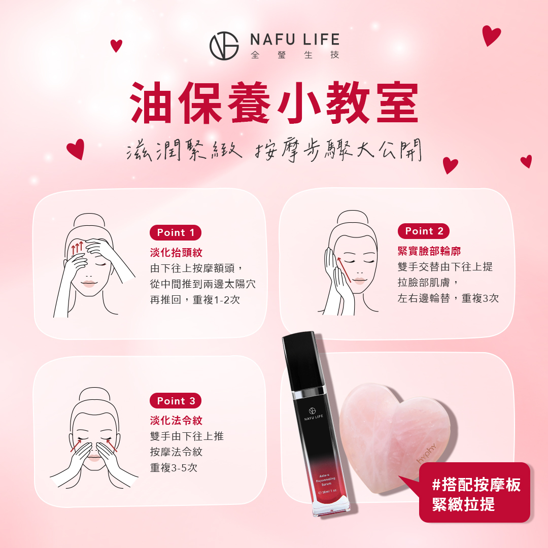 精華油可滋潤修護肌膚,延緩肌膚老化。然而,精華油若延展性佳,可以搭配按摩手法、按摩板使用,可針對魚尾紋、抬頭紋、法令紋,以及緊實輪廓線等等加強按摩,按摩方式可參考圖示。
