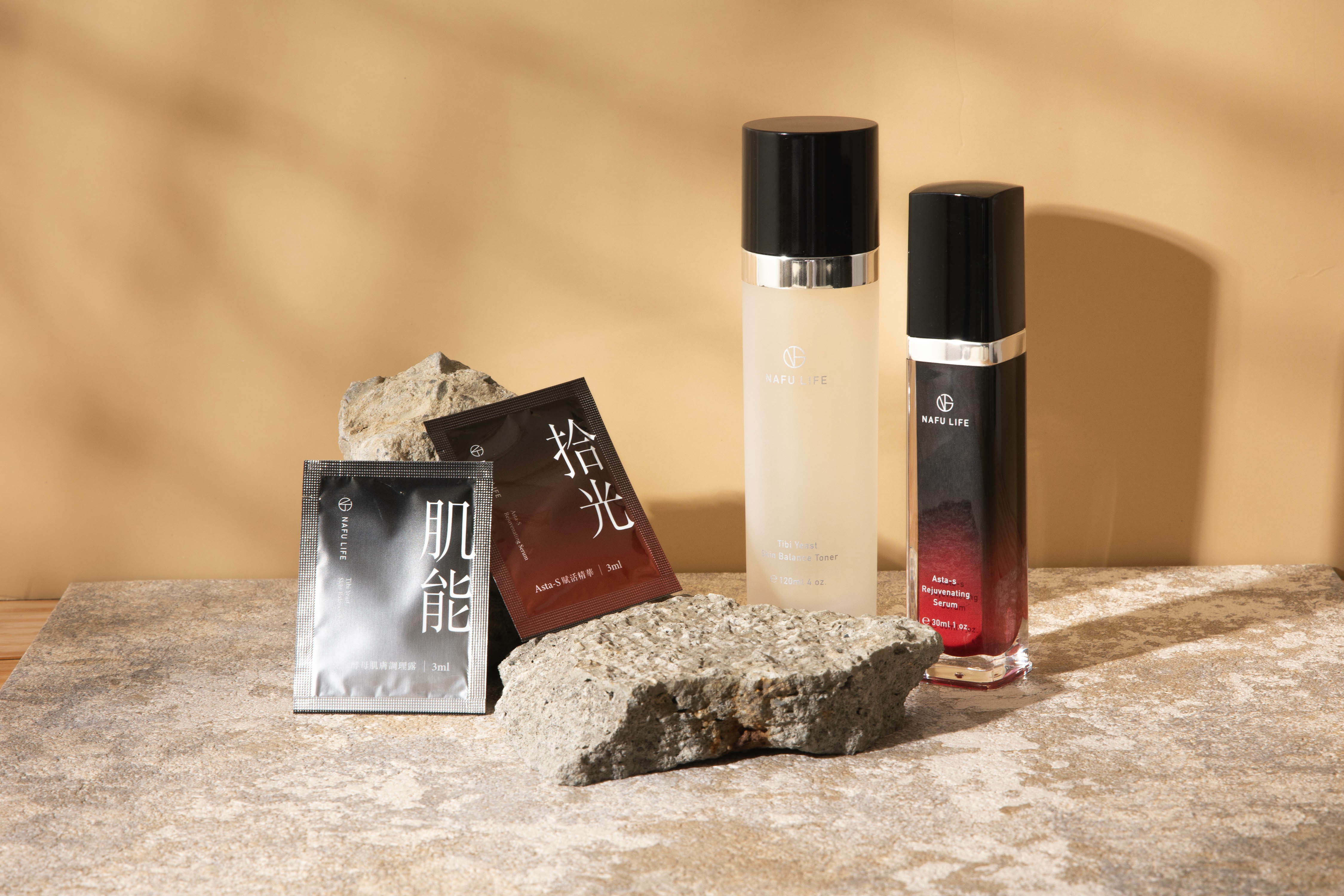 NAFU LIFE賦活青春禮盒,含有水相保養緹比酵母肌膚調理露(肌能白瓶)以及油保養Asta-S賦活精華(拾光黑瓶),每天僅需兩步驟就可以搞定保養。