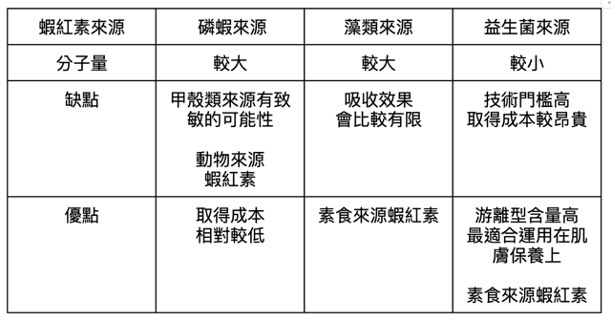 現在素食意識逐漸上升,因此在使用蝦紅素保養品前,也要記得確認來源,簡單介紹蝦紅素來源,可以參考表格: