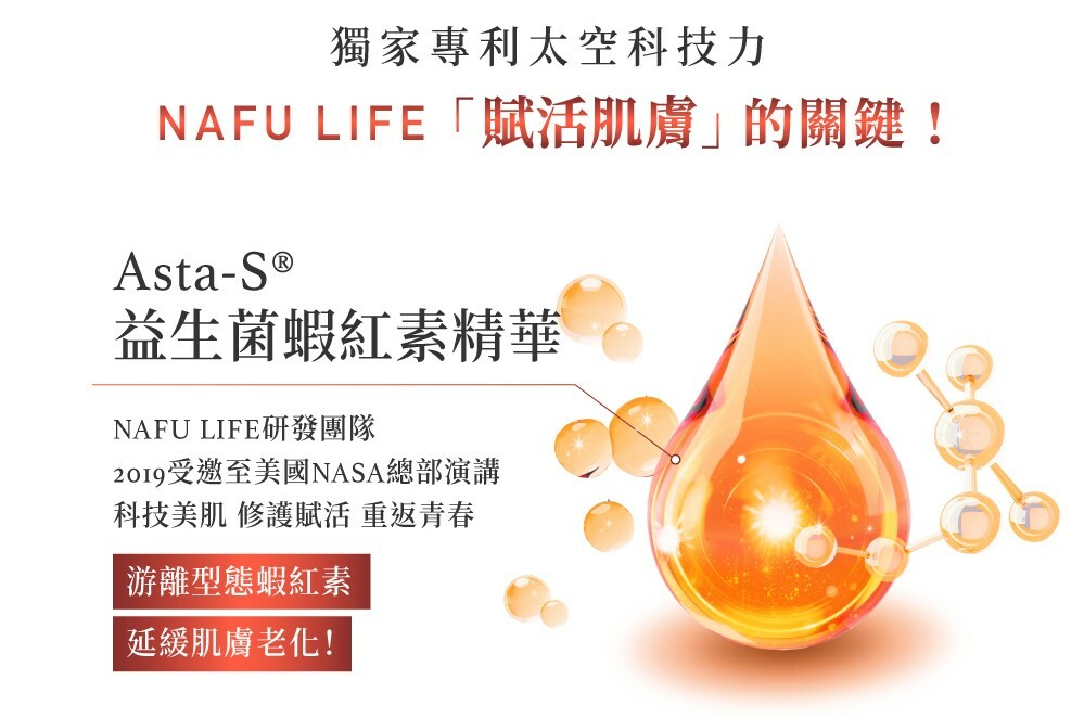 Asta-S賦活精華添加獨特珍稀成分──Asta-S超級蝦紅素,以超強保護力提升肌膚狀態、延緩肌膚老化,可以防止、修護肌膚因環境因子產生的細紋、乾燥等問題。此外,更添加六胜肽、海茴香植萃精華等成分,達到長效鎖水、舒緩乾燥肌膚的作用。更因此,研發團隊受邀至美國NASA演講,分享此獨家專利原料幫助提升太空人的肌膚保護力!Asta-S賦活精華更榮獲國內外各項大獎:像是國際品質評鑑大賞Monde Selection「特級金獎」肯定、國家玉山獎最佳產品類以及提倡環境永善的嘉誠微笑盃Taiwan Top10!NAFU LIFE團隊持續追求高品質、創新研發的最佳動力,致力於將科學融入美麗,賦活青春,讓您以油喚醒青春,擺脫年齡痕跡!