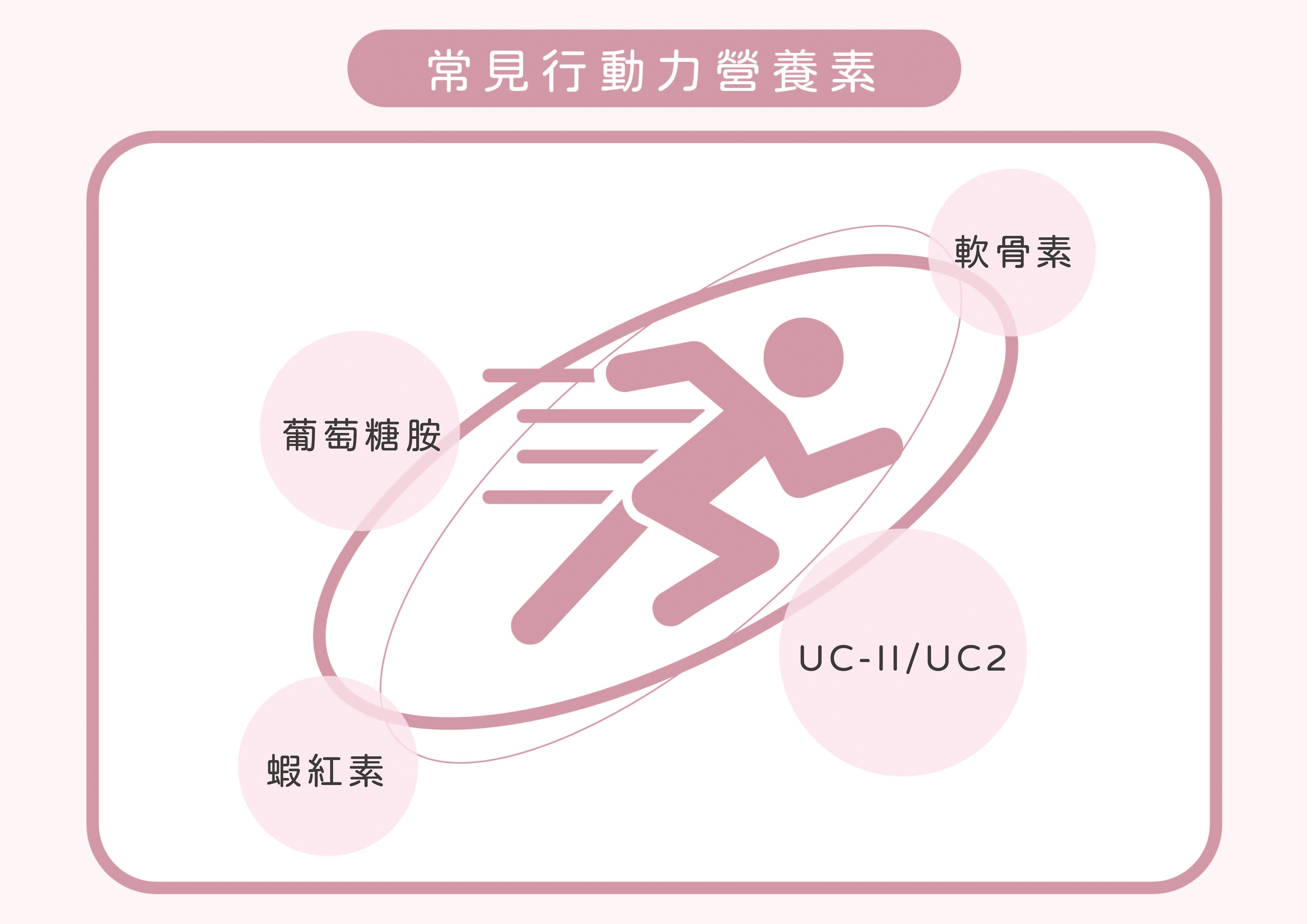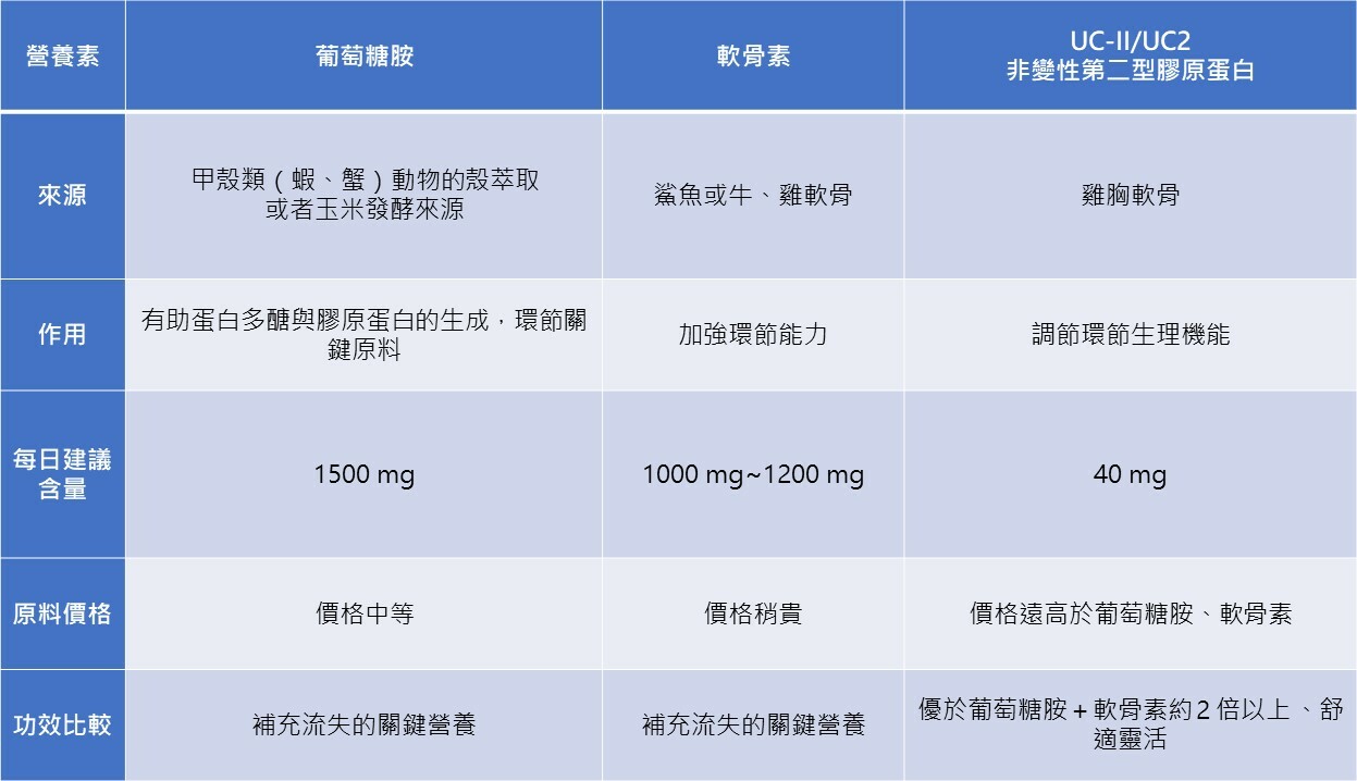 看到右側圖表,其實可以知道我們的環節可不是只有單一組成,其中還包括了:水、UC-II/UC2(第二型膠原蛋白,Type-II Collagen)、蛋白聚醣(葡萄糖胺、軟骨素)、纖維、玻尿酸以及結締組織等物質。正是因為這些物質構成了我們的行動力,才能保護我們不受傷,所以市面上才會都是出現這些營養素的保健品。和行動力相關的營養素這麼多,最常見的正如上面圖表所提及的葡萄糖胺、軟骨素、UC-II/UC2。下面就來介紹說明各個營養素吧!