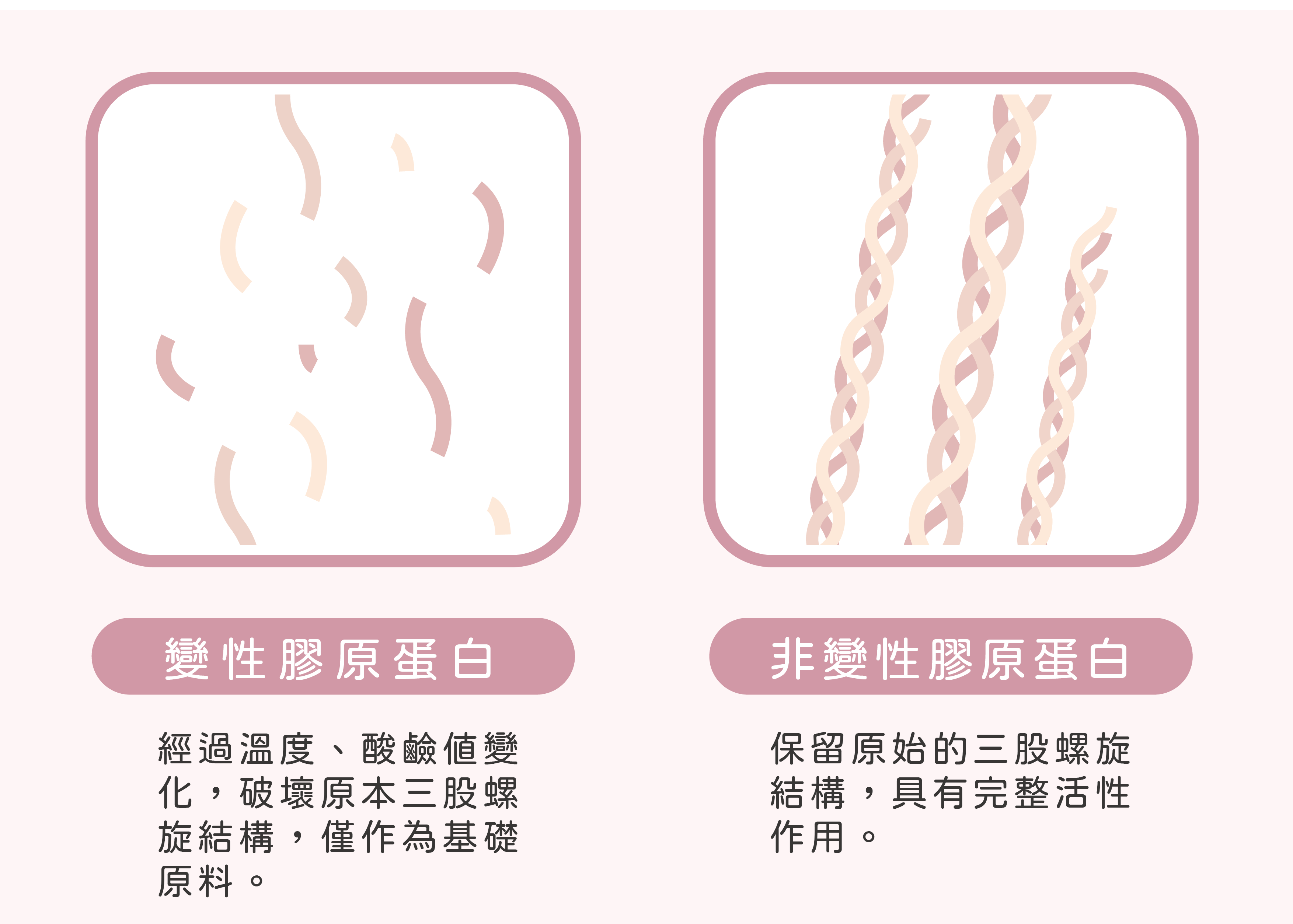 看到名字出現非變性第二型膠原蛋白,你一定會好奇,那變形的是什麼?第一型膠原蛋白又是什麼?所謂的變性/非變性指的是在萃取膠原蛋白時,製程對於蛋白質的影響:若是在萃取膠原蛋白時有經過高溫水解或是其他任何因素(溫度、酸鹼變化)改變了蛋白質的結構就稱作「變性膠原蛋白」,以日常生活來舉例,就像是在烤肉時,生肉是呈現粉色、柔軟的狀態,但是加熱過後,就變成不同顏色、質地也不同,這便是所謂的「變性」:蛋白質失去原本的狀態、結構及特性。而膠原蛋白若是採用低溫萃取的方式,讓蛋白質仍可以保留像辮子一樣的三股螺旋結構,即是「非變性」,在蛋白質保留完整的結構、狀態下,可以提供原有的生理作用、營養補充,當然,在價格上「非變性」膠原蛋白也會比較昂貴一些。