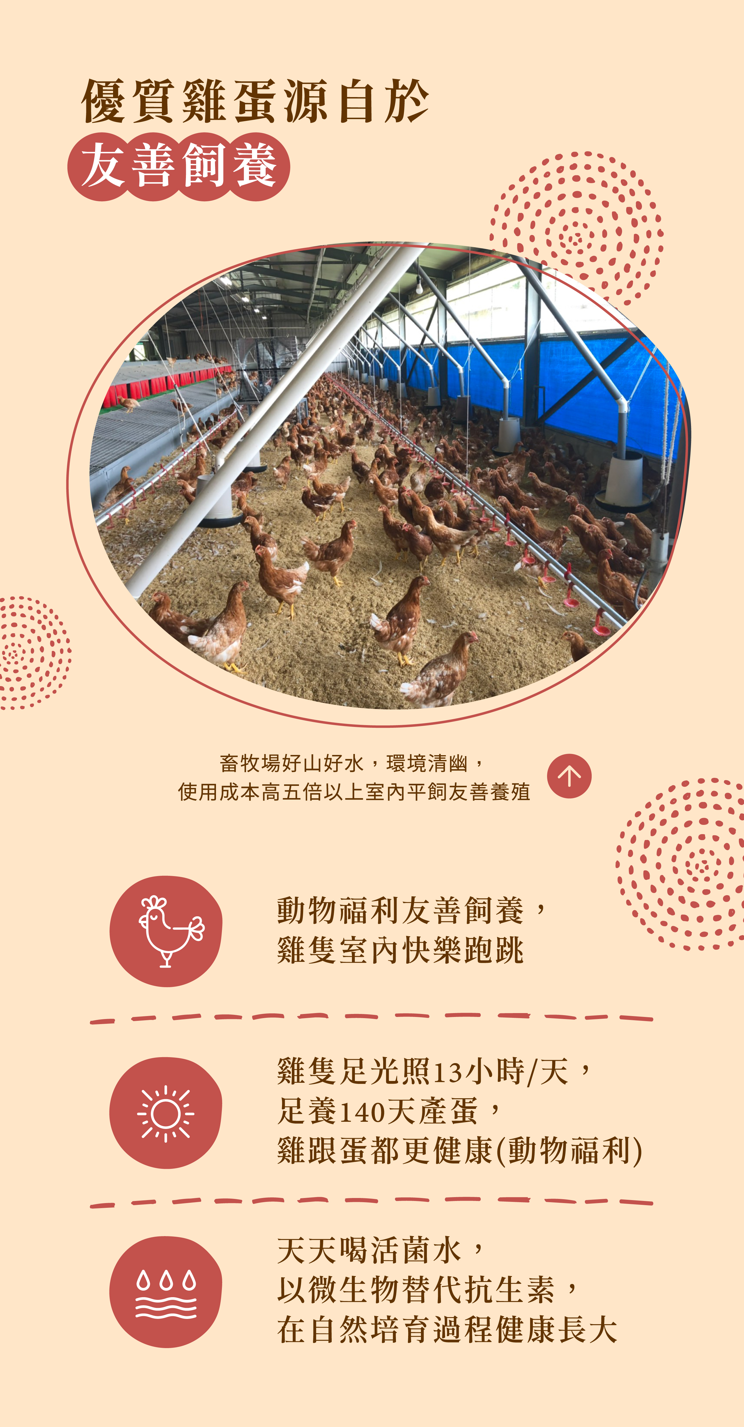 • 獨家專利PB+微生物替代抗生素,不僅照顧雞隻健康,生產的蛋營養又美味