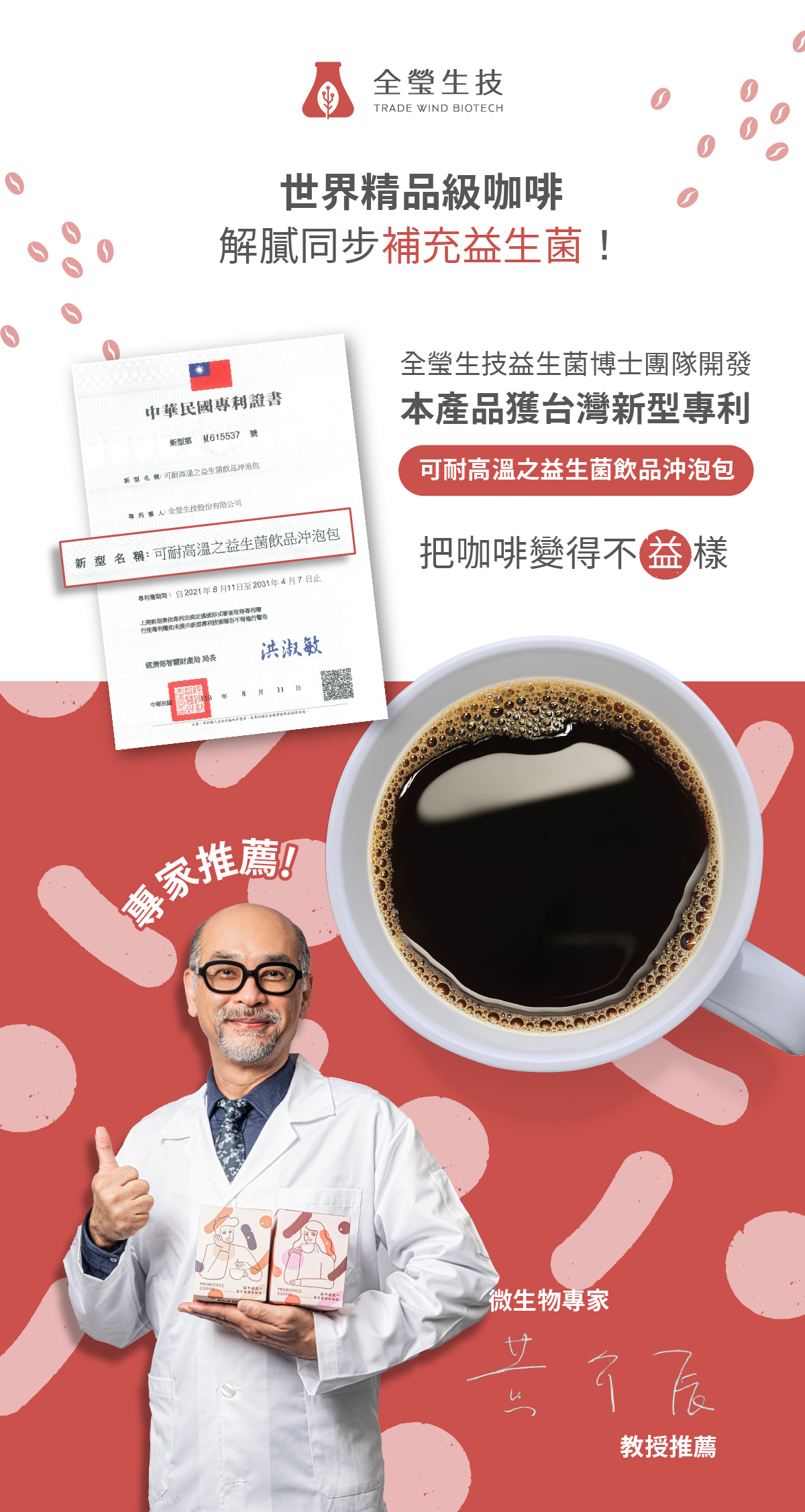 ※全瑩生技特有三益菌配方,具「可耐高溫之益生菌飲品沖泡包」專利